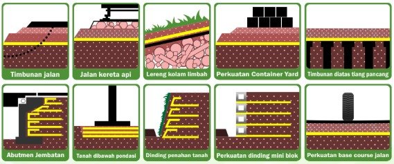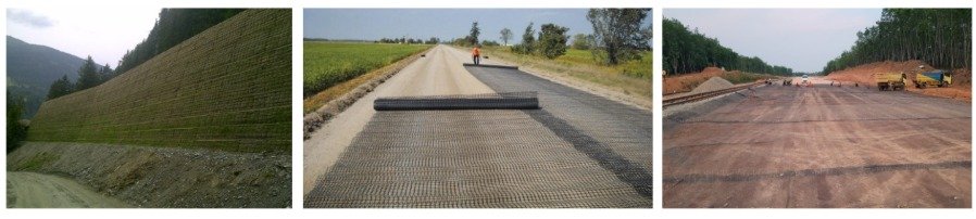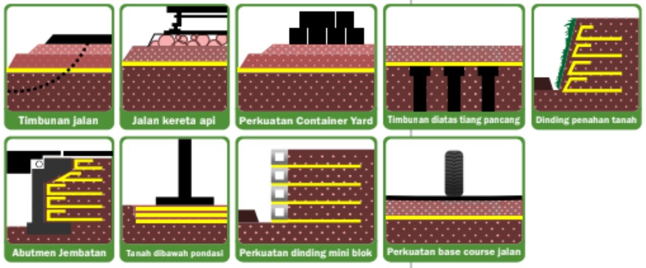 Geogrid cocok digunakan untuk perkuatan timbunan jalan, jalan kereta api, dinding penahan tanah, abutmen jembatan, lereng, container yard, serta konstruksi di atas tanah lunak atau di atas tiang pancang.