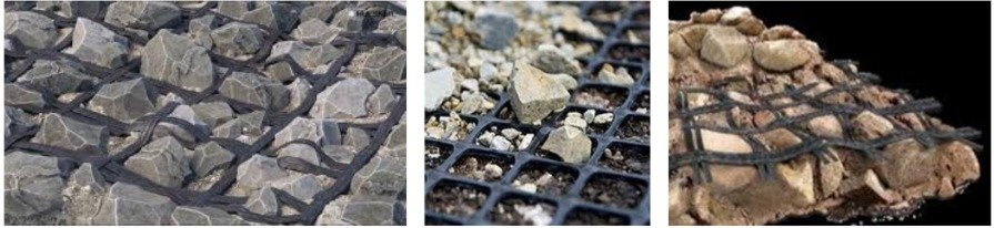 Geogrid bekerja dengan Interlocking dengan timbunan granular atau material lain yang ada diatasnya. Timbunan granular akan masuk kedalam lubang-lubang geogrid dan akan saling mengunci satu dengan yang lainya, karena adanya kekangan dari kakuatan pita-pita geogrid. Beban kendaraan akan ditransfer dan didistribusikan secara merata oleh geogrid ke lapis timbunan dibawahnya. Penggunaan geogrid pada lapis BaseCourse / Sub-Base dapat mengurangi kerusakan akibat Routing (bekas roda) pada jalan.