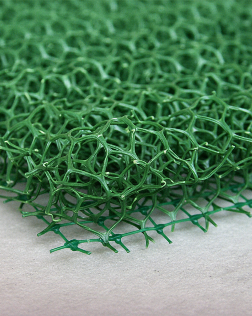 Geomatt terbuat dari bahan HDPE yang dilengkapi perlindungan anti-UV, sehingga memiliki daya tahan tinggi terhadap cuaca dan paparan sinar matahari. Material ini mendukung pertumbuhan vegetasi dengan memungkinkan akar tanaman mengikat tanah dan matras secara alami, sehingga meningkatkan stabilitas lereng dalam jangka panjang.